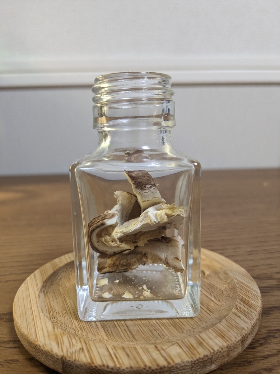 椎茸は乾燥している方が、旨味成分を多く含んでいる為、今回は乾燥椎茸を使用していきたいと思います。椎茸を小瓶に思う存分詰めていきます。